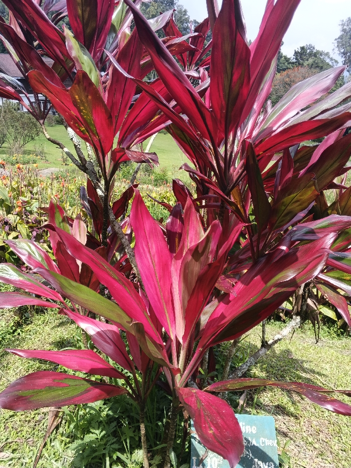 The image displays an outdoor botanical scene, located in La Castellana, Philippines. The foreground is dominated by several Cordyline fruticosa plants, characterized by elongated, lanceolate leaves in vibrant shades of deep red and magenta, with some green streaking and variegation. Woody stems are visible among the foliage, some exhibiting light-colored patches indicative of lichen. At the base of a central plant, a partial light-blue sign is present, with legible text fragments "line," "A. Chev," and "Jawa," likely for plant identification. In the midground, to the left, a flowerbed contains smaller plants with yellow-orange blossoms. Behind this, a well-maintained green lawn extends, sloping gently upwards and featuring scattered grey rocks. The background includes a building with a dark roof and light walls, partially obscured by trees on the upper-left side of the slope. A dense treeline borders the horizon under a pale blue sky. No individuals or actions are observed within the frame.