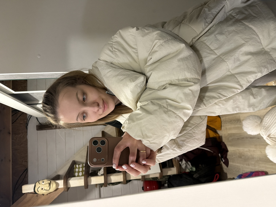 An interior mirror selfie captures a young adult female within an unspecified residence in the city of Раздолье, Russia. The female, visible from the chest up, possesses light brown hair pulled back, blue eyes, and fair skin. She wears a light beige or off-white quilted puffer jacket. Her left hand, adorned with white nail polish and a gold-colored ring on the ring finger, holds a brown-cased smartphone equipped with a triple-lens camera array, positioned to capture her reflection. Her right hand is partially obscured by her jacket but appears to assist in holding the phone. Her gaze is directed towards the smartphone screen, exhibiting a subtle smile. The reflected background reveals a rustic interior with light-colored wooden paneling or floorboards. To the left, a light wooden shelving unit or part of a staircase is visible. On an upper shelf, a light-colored mask with a prominent mustache, consistent with the Salvador Dalí mask, is displayed. Below it, a green and white patterned box is present on another shelf. Electrical wires are visible near the top left of the reflected image. The lower portion of the reflection shows light wooden floorboards with various items, including dark clothing or bags, and a red cylindrical object. In the immediate foreground, at the bottom edge of the mirror, a white knit hat with two pom-poms rests. The mirror is framed on the right by a white border.