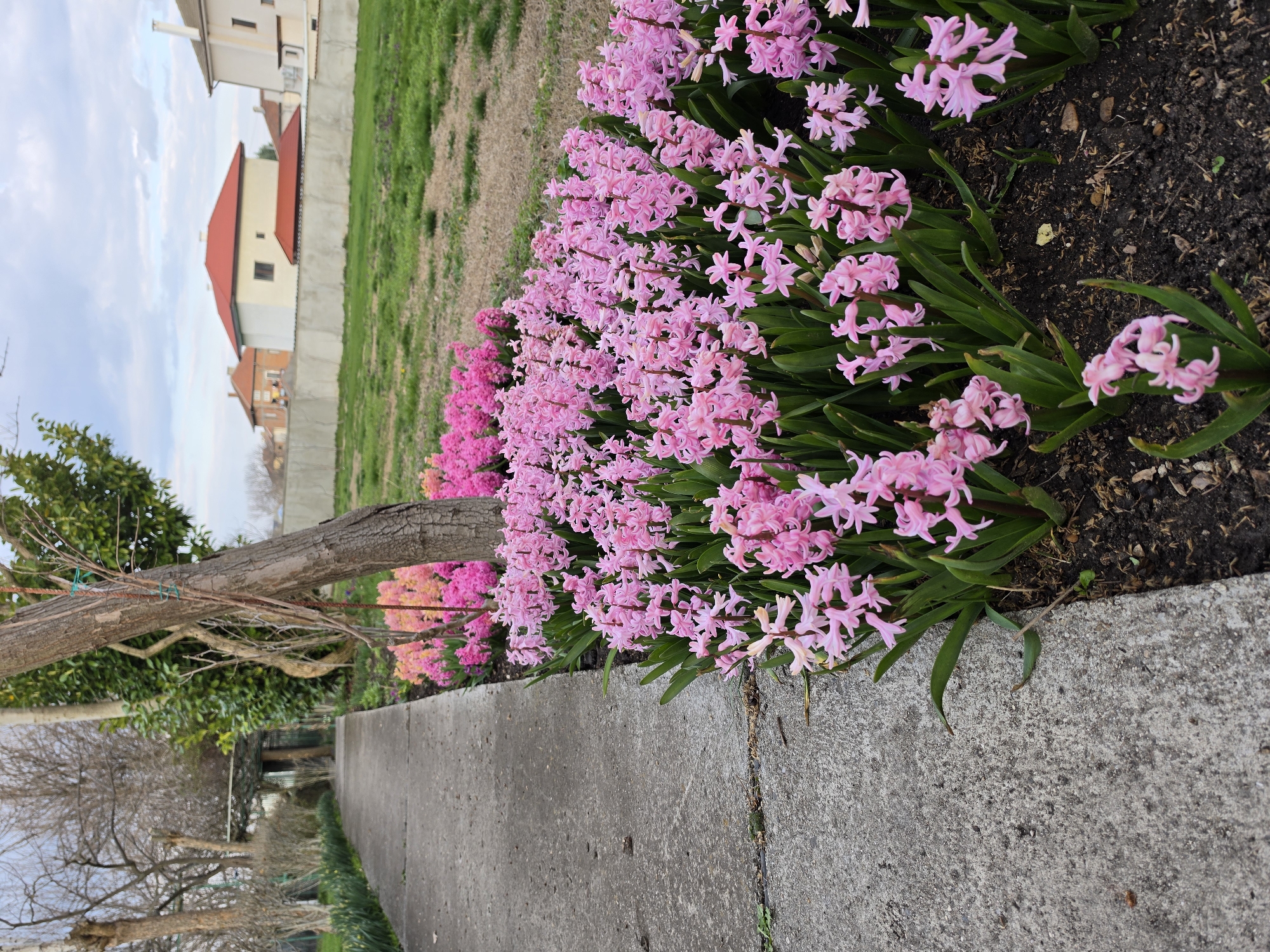 The image depicts an outdoor garden scene within the city of Dobrich, Bulgaria. A concrete pathway occupies the left side of the frame, extending into the distance. Adjacent to the pathway on the right, a densely planted flowerbed features numerous pink hyacinths in full bloom, characterized by their clustered, bell-shaped flowers and dark green foliage. Behind this initial bed, further rows of pink and light orange hyacinths are visible. A tree trunk is partially visible near the center-right, separating the flowerbeds. Beyond the immediate garden area, a wide grassy expanse stretches towards a low concrete wall. In the background, several residential-style buildings with red-tiled roofs are observed under an overcast sky. No individuals are present in the scene.