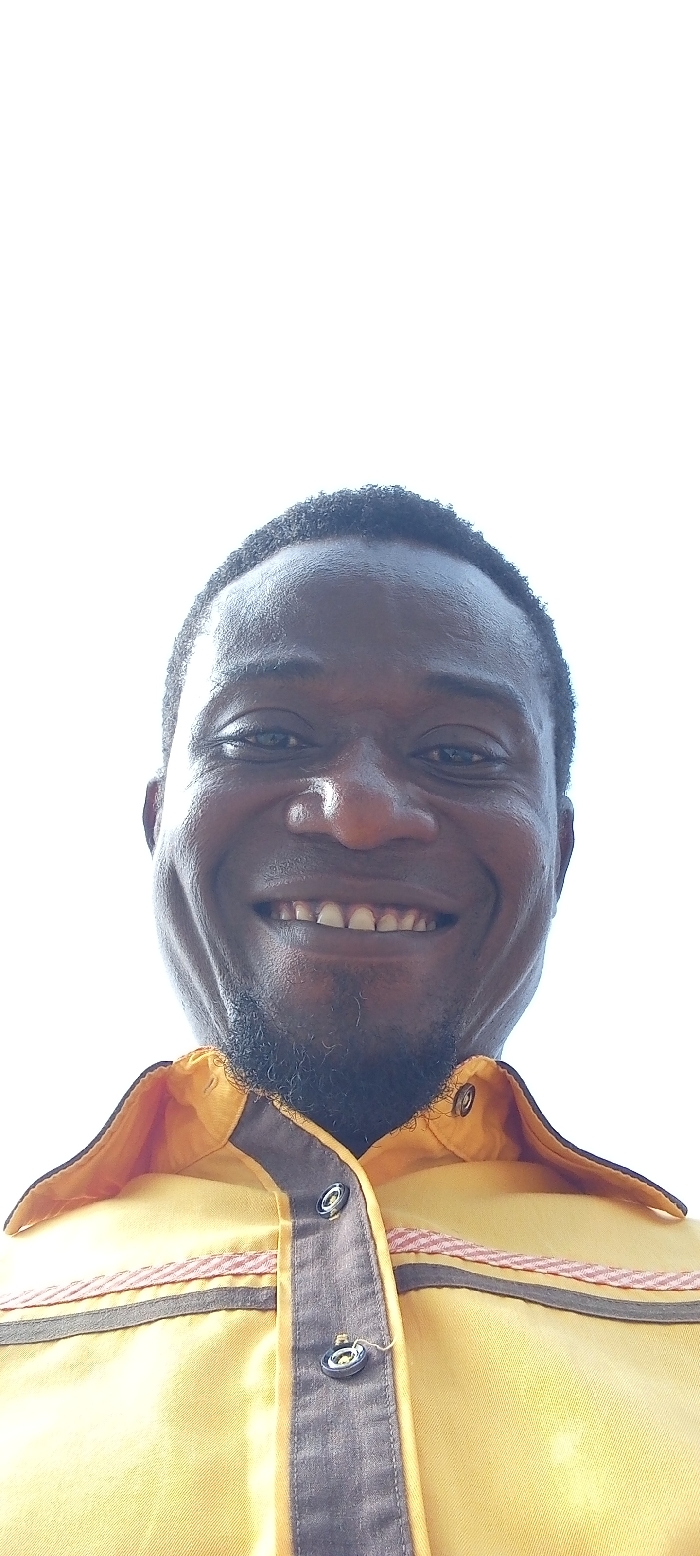 An upward-facing, close-up photograph captures an adult male of African descent, located in Akure, Nigeria. The man occupies the lower two-thirds of the frame, looking directly at the camera with a wide smile that reveals his upper teeth, some displaying minor discoloration. He has short, dark, tightly cropped hair and a dark goatee. He is wearing a yellow collared shirt featuring a dark grey placket and collar, with two visible dark grey snap buttons fastened. Above a horizontal dark grey stripe on the upper chest, a thin, reddish-pink braided stripe is present. The background is uniformly white and overexposed, providing no discernible environmental context. No other individuals, objects, actions, or interactions are visible in the scene.