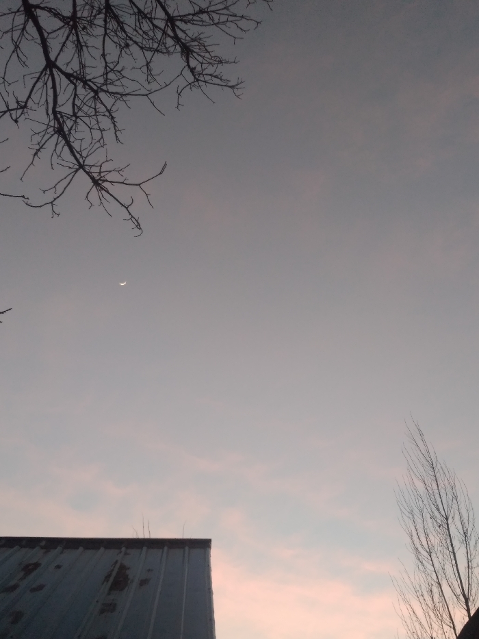 The image depicts an outdoor scene at twilight or dawn in Гава, Kyrgyzstan. The sky, which occupies the majority of the frame, displays a gradient from a pale pinkish-orange near the lower horizon to a dull gray-blue overhead. A distinct, slender white crescent moon is visible in the upper-left portion of the sky. Bare, leafless tree branches with intricate forms are silhouetted against the sky, extending into the frame from the top-left corner. The upper edge of a building's roof, constructed from corrugated metal with visible areas of rust or weathering, occupies the lower-left quadrant. A small section of bare tree branches is also visible entering the frame from the lower-right. No individuals are present in the scene.