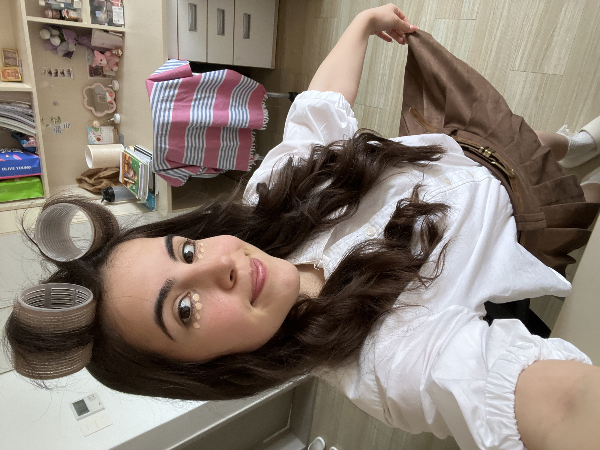A selfie captures a young woman indoors, likely in her home. She is wearing two hair rollers and small dots of an unknown substance under her eyes. She is dressed in a white blouse and a brown skirt, holding the skirt up with her right hand. The background shows a shelf with various items, including a pink teddy bear, some books, and a striped cloth. The floor is a light-colored wood. Given that "Olive Young" packaging is visible, and the context of the prompt, the location is plausibly in Daegu, South Korea.