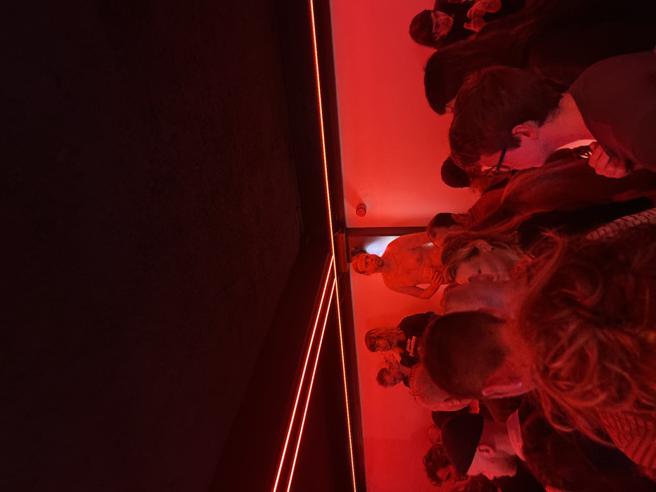 A red-lit room features a gathering of people, with individuals clustered in the lower right