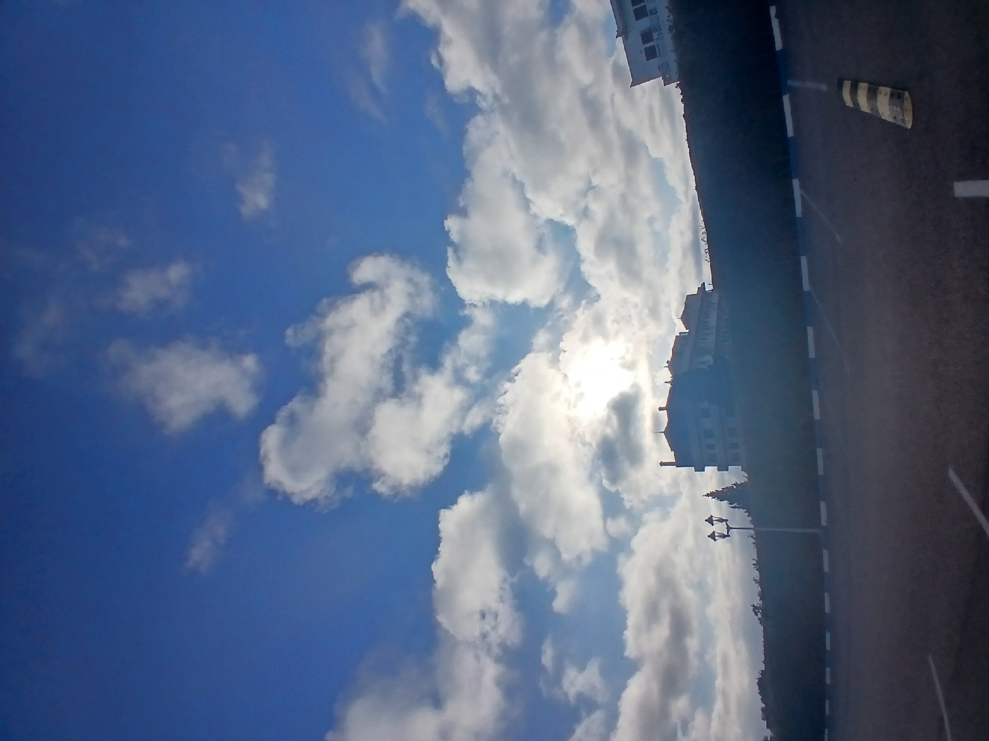 The image depicts an outdoor scene in M'Diq, Morocco, under a bright blue sky partially filled with scattered white cumulus clouds. The sun, partially obscured by clouds, creates a bright glare in the upper-mid section of the frame, illuminating the scene from behind the central background structures. In the foreground, an asphalt parking lot is visible, featuring faint white painted lines indicating parking spaces. A blue and white painted curb separates the parking lot from a raised, dark, densely vegetated embankment that dominates the midground. On the right side of the parking lot, a yellow and black striped parking block rests on the asphalt. Rising from the vegetated embankment, slightly to the left of the image center, stands a black, dual-fixture street lamp. To its right, a dark evergreen tree is visible. Two multi-story buildings are partially visible atop the embankment in the background. The building on the left features a reddish-brown tiled roof and dark walls, appearing somewhat silhouetted against the bright sky, with multiple visible windows. To the far right, a second building with lighter-colored walls (white or light grey) and multiple balconies is also partially visible, extending slightly above the tree line. No people or discernible activities are present in the scene.