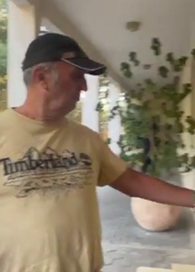 A man wearing a Timberland shirt, jeans, a cap, and two silver bracelets on his left wrist is standing on a porch