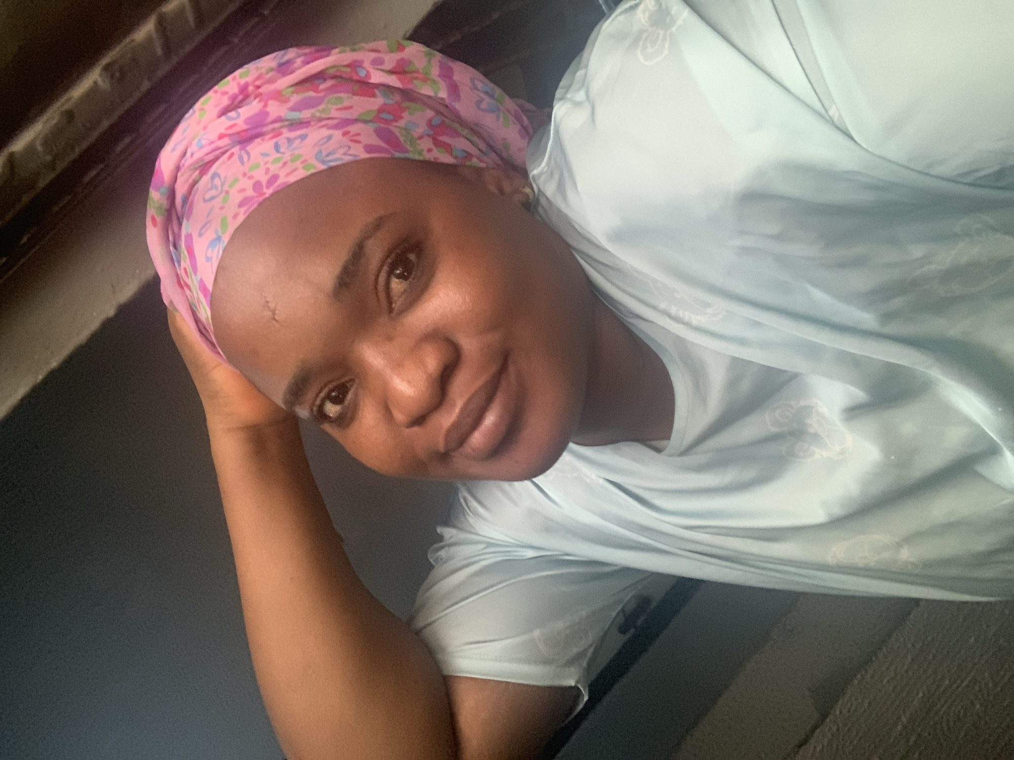 A medium shot depicts a person with dark skin lying down, wearing a light blue shirt with a floral design, and a pink headscarf patterned with a floral print. The person is resting their head on their left arm, and their face is angled towards the camera with a slight smile. A dark, textured surface is partially visible behind the person and to the left of the frame. The scene appears to be indoors, and based on the prompt, is located in Barakin Akawo, Nigeria.