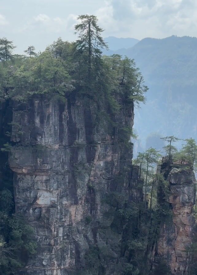mountainous, forested landscape in Zhangjiajie National Forest Park, China. In the foreground, two large stone pillars stand tall, topped with trees and greenery. The pillars' surfaces display layers of rock and crevices. In the background, a soft, hazy blue covers distant mountains and forest, creating a sense of depth. The sky is overcast with light clouds. The camera slightly pans to the right, shifting the focus from the first pillar to the second.