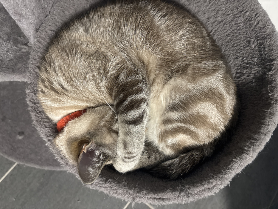 - "An overhead view captures a domestic cat, distinguished by its grey and beige tabby fur pattern, curled tightly into a spherical sleeping position within a grey, plush pet bed" by FM-YF4vE3, licensed under CC BY 4.0