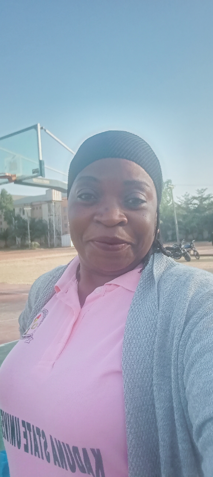 The image displays a self-portrait of an adult female in the foreground, exhibiting a slight smile. She has a dark complexion and is wearing a black knitted cap, a light pink collared polo shirt with "KADUNA STATE UNIVERSITY" text (reversed due to the selfie perspective) and a logo on the left chest, and a light grey open cardigan. The background features an outdoor court or field under a clear blue sky. To the left, a basketball hoop with a clear backboard is visible. Beyond the court, multi-story buildings, a water tower, and sparse trees are present. On the right side of the background, a utility pole and two parked motorcycles are discernible. The scene is located on the campus of Kaduna State University, Kabala, Kaduna, Nigeria.
