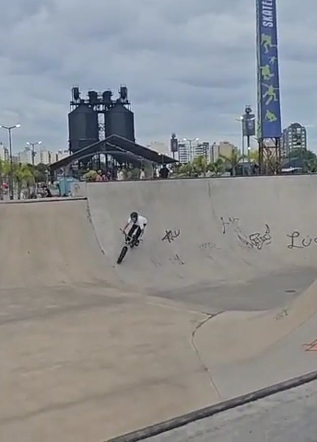 young man performing tricks on a BMX bike in a concrete skatepark bowl. He is wearing a helmet, a white t-shirt, and dark pants. He skillfully maneuvers around the curves and ramps of the bowl. The skatepark is located in an urban environment, with buildings, trees, and other structures visible in the background. There are other people around the park, including some watching from a nearby platform. The sky is overcast. A tall banner with "SKATEPARK MAR" is visible in the background. Graffiti is present on the concrete walls of the skatepark.
