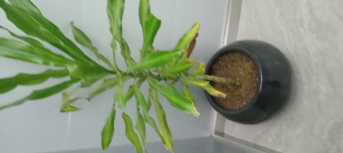 The image displays a single potted houseplant, likely a Dracaena variety, centered against a light-colored tiled wall. The plant features elongated green leaves, some of which exhibit visible yellowing and browning, particularly towards the lower and outer edges, suggesting plant stress or natural aging. Its central stem is robust and visible above the soil line. The plant is contained within a dark grey or black, rounded, bulbous pot filled with brown soil. The background consists of a light grey or off-white tiled wall with horizontal grout lines. Below the pot, a lighter grey tiled floor with a subtle textured or marbled pattern is visible. There are no individuals, animals, or specific actions or interactions depicted. The scene is an indoor environment. The image provides no visual indicators to determine a specific location within Nairobi, Kenya.