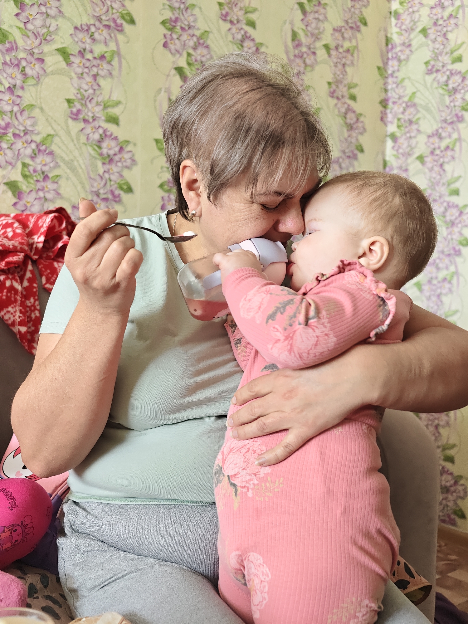 An adult female and an infant are depicted in a close embrace within an indoor residential setting in Уральское, Russia. The adult, with short grey hair and wearing a light green short-sleeved top and grey pants, is seen holding a spoon containing a white substance near her own mouth with her right hand. Her left arm supports the infant, whose head is pressed against the adult's forehead. The infant, with light brown hair, is dressed in a pink, long-sleeved, ribbed bodysuit or jumpsuit with a floral pattern and is holding a clear plastic bottle containing a pink liquid, appearing to drink from its white nipple. The background features light green wallpaper adorned with a repeating pattern of purple and white floral clusters. A red and white patterned fabric object is partially visible on the left, and a pink soft toy is seen in the lower-left foreground.