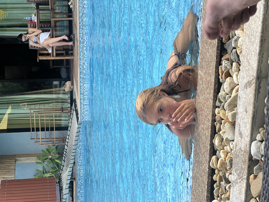 This image depicts an outdoor swimming pool area in Ban Tha Muang, Thailand, under daylight conditions. In the midground, a fair-skinned female with wet, light-colored hair is partially submerged in the blue-tiled pool, resting her upper torso on the pool's edge. She wears a dark-colored swimsuit, and her hands are clasped near her mouth while she gazes towards the upper right of the frame. Reddish marks are visible on her cheeks, and a white earring is present on her left ear. In the background, on a tiled patio adjacent to the pool, a second female individual with dark hair is seated on a wooden chair at a wooden table. She is dressed in a dark top, a white skirt, and dark flip-flops, and is actively engaged with a smartphone held in both hands. A plastic water bottle is positioned on the table beside her. Behind the patio, a building with a large reflective glass door is visible, along with green foliage and a wooden privacy fence on the left. A bamboo rack stands upright near the building. A black mesh hammock-style lounger is partially visible, extending from the pool edge towards the background on the left. The pool coping in the foreground consists of a light brown stone slab bordered by embedded pebbles. In the extreme foreground, on the bottom right, the bare toes and front portion of a human foot are visible, resting near the pool's edge.