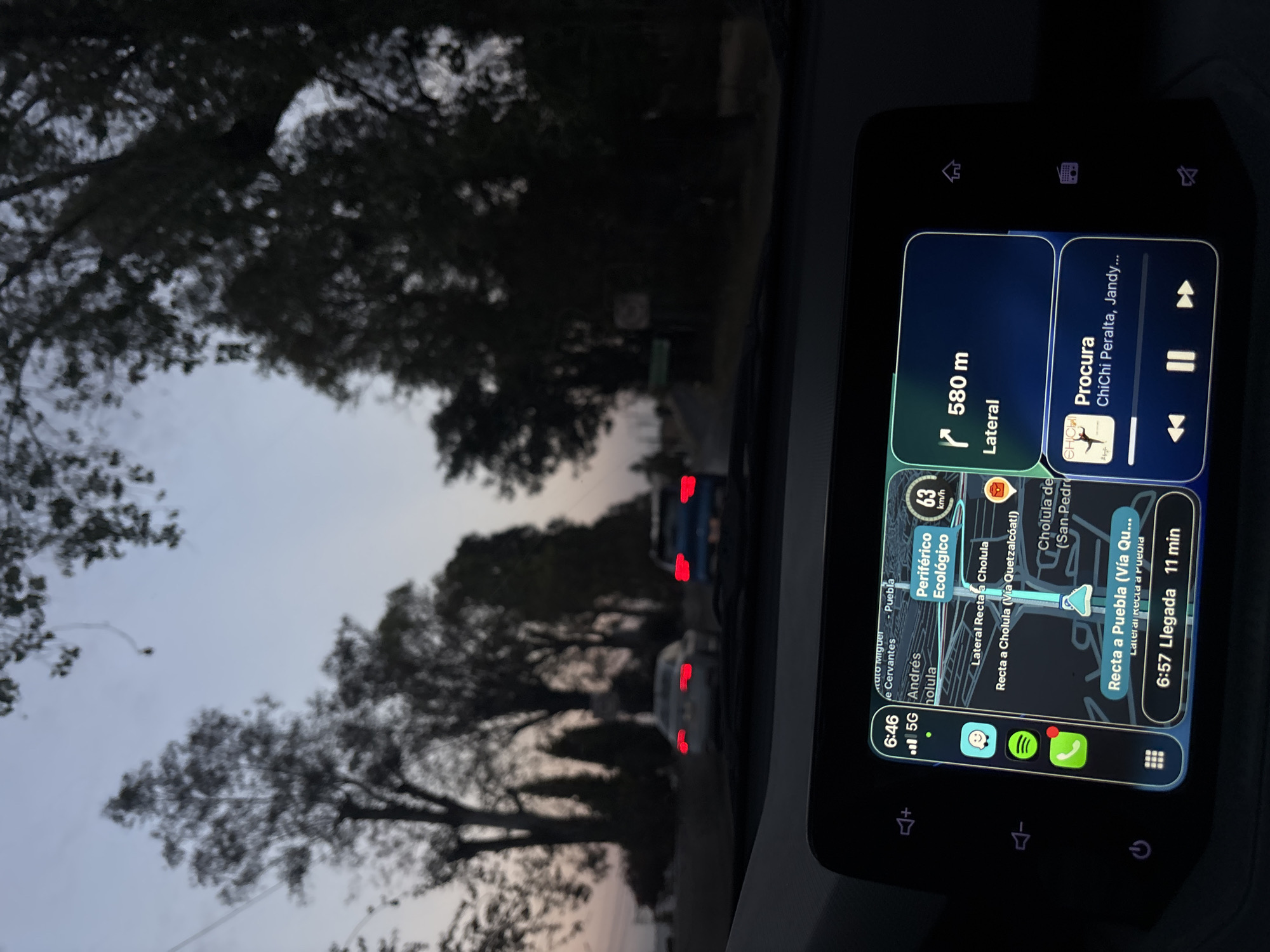 The image captures an interior view from a vehicle, looking forward through the windshield at a road scene during low light conditions, likely dusk or dawn. The sky overhead transitions from a pale hue at the horizon to darker tones, silhouetting numerous tall trees lining both sides of the road ahead. Two vehicles are visible in the distance, traveling in the same direction as the observer: a silver sedan to the left and a blue SUV to the right, both displaying illuminated red taillights. In the foreground, the vehicle's infotainment display is prominently visible. The screen presents an Apple CarPlay interface, indicating the time as 6:46 and showing 5G cellular connectivity. A navigation map occupies the central portion, clearly indicating the current location within San Andrés Cholula, Mexico, with the route traversing "Recta a Cholula (Vía Quetzalcoatl)" towards "Recta a Puebla." The map highlights an upcoming turn for "Lateral" in 580 meters, with an estimated arrival time of 6:57 (11 minutes). A speed limit of 63 km/h is displayed on "Periférico Ecológico." To the right, an audio player is active, showing the song "Procura" by "ChiChi Peralta, Jandy..." with standard playback controls. The display is framed by illuminated touch-sensitive buttons for volume, power, and menu functions. The scene depicts a driver actively navigating through the San Andrés Cholula area.