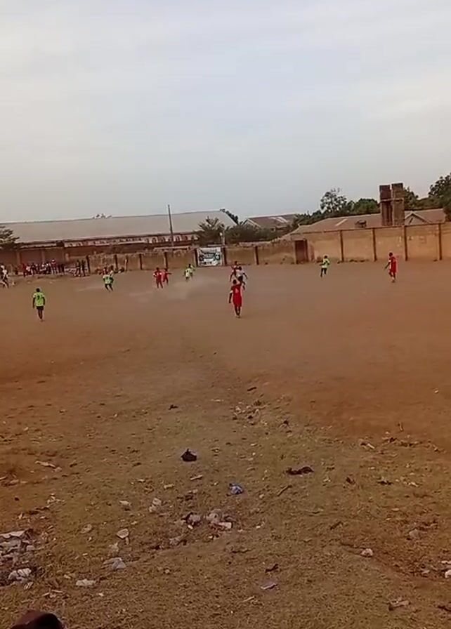 soccer game on a dirt field. There are players wearing red jerseys and players wearing green jerseys. The players are spread out across the field, moving and kicking the ball. There are buildings and a wall in the background. The sky is overcast. The ground in the foreground is littered with debris.