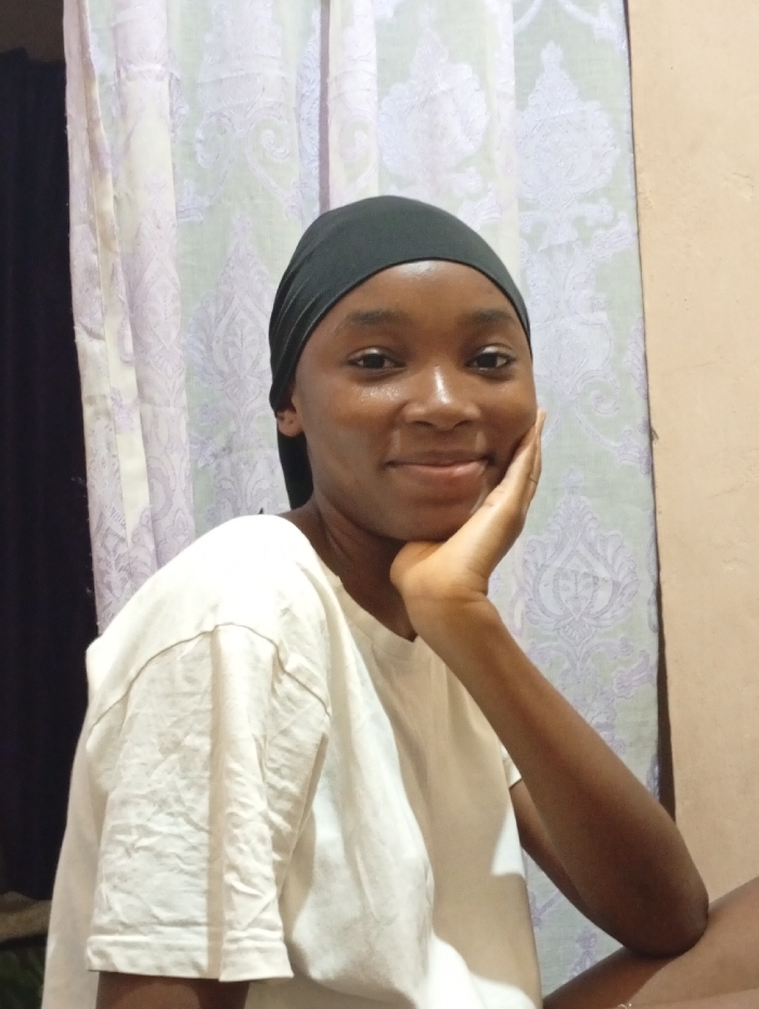 A young adult female with dark skin is depicted in a chest-up indoor portrait