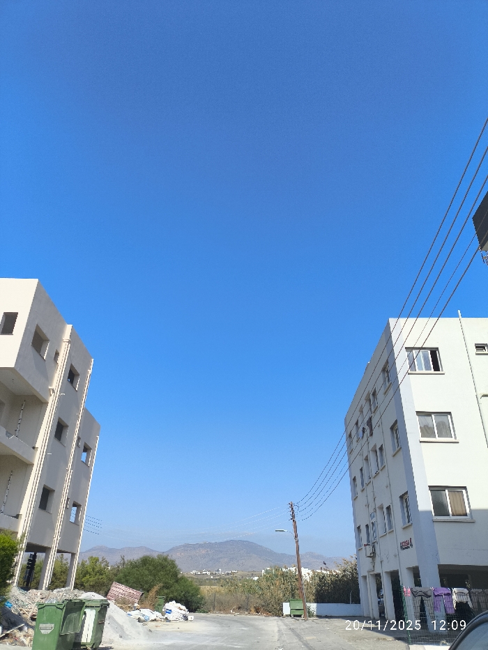 The image depicts an outdoor scene under a clear, bright blue sky in the city of Unknown, Unknown, at approximately 12:09 on November 20, 2025. Two multi-story buildings flank a neglected dirt road or path that recedes towards a distant mountain range. On the left, a light-colored, multi-level building appears to be under construction or unfinished, with exposed concrete or unpainted surfaces and dark, empty window openings. At its base, a pile of construction debris, including rubble and plastic sheeting, is accumulated next to two green refuse bins. Sparse vegetation grows behind this debris. On the right, a completed, light-colored five-story building with multiple windows featuring white frames and interior blinds is visible. A sign is affixed to its side, and laundry or fabrics are hung near the ground level. A wooden utility pole with multiple overhead power lines stands in front of this building, equipped with a street light fixture. A single green refuse bin is positioned near the utility pole. The midground between the buildings and pole consists of an unkempt area with dry brush and scattered small trees. In the far background, a distinct range of hills or mountains is visible under the clear sky, with sparse vegetation and a few scattered white structures on its slopes. No individuals are present in the scene.