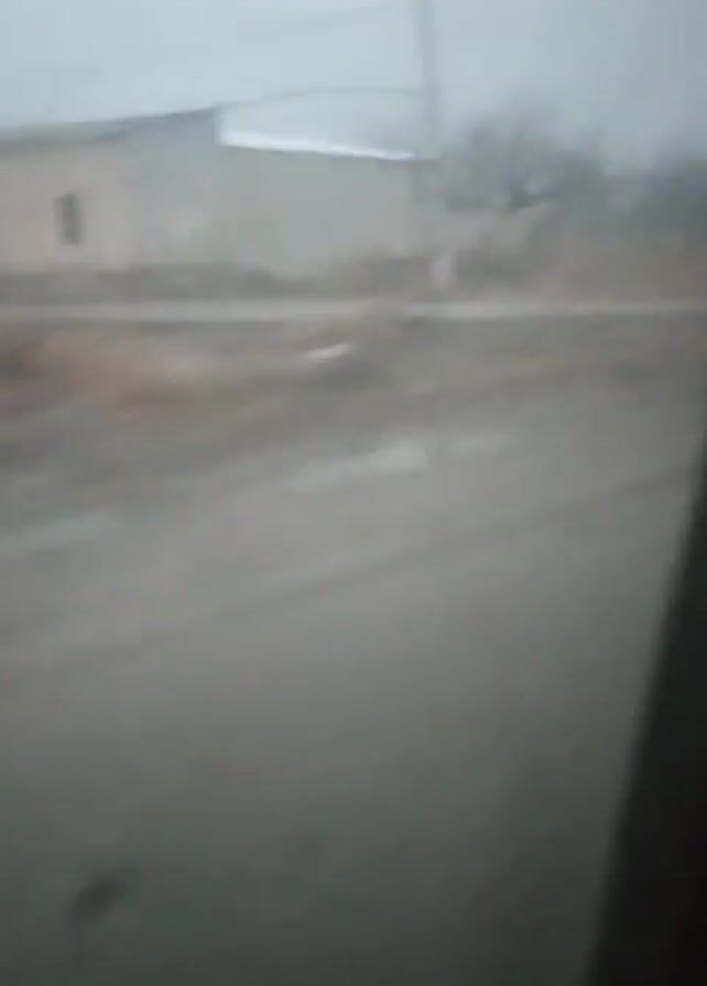 view from a moving vehicle driving on a wet road. The weather appears overcast and rainy. Buildings and vegetation can be seen indistinctly in the background. The camera is unsteady and the focus is not sharp.