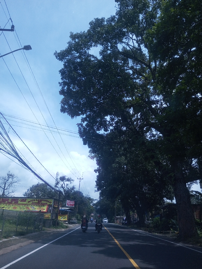 This image depicts a daytime scene on a paved road in the city of Chori, Nigeria. The sky, visible in the upper half of the frame, is light blue with scattered white clouds. Numerous overhead power lines and communication cables traverse the upper left, supported by utility poles. A grey street light fixture is mounted on a pole in the upper left. The asphalt road, marked with a solid white line on its left edge and a solid yellow centerline, extends into the distance. Two motorcycles, each with a rider, are traveling away from the camera in the right lane. One motorcycle carries an additional passenger. A white car is visible further down the road, behind the motorcycles. Tree shadows are cast across the road surface. The left side of the road features a low green fence or vegetation barrier. Behind this, several commercial signs are visible, including a large yellow banner with red and black text, partially readable as "BAKSO LAPANGAN" and "AYAM BAKAR," and a smaller red and white sign displaying "HOTEL." Another utility pole stands further back, and a cell tower or antenna structure is discernible in the mid-ground. Sparse-leaved trees are also present on the left. The right side of the road is bordered by a row of tall, mature trees with dense, dark green foliage, casting deep shadows onto the road and roadside. The trunks of these trees appear thick and textured. Portions of structures or buildings are vaguely visible behind the trees in the distance on the right.