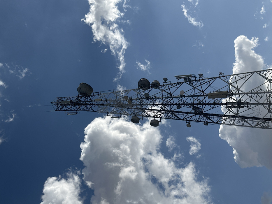 - "A tall, metallic, lattice-structured telecommunications tower stands against a bright blue sky with scattered white cumulus clouds" by FM-KEB4x1, licensed under CC BY 4.0