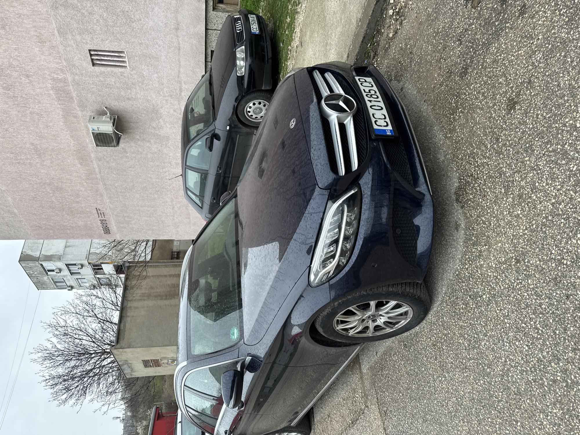 two cars parked on a street in Silistra, Bulgaria. The foreground car is a dark blue Mercedes-Benz with the license plate "CC 0185 CP". Behind the Mercedes-Benz is a dark-colored Audi with the license plate "CC 7536 AT". The cars are parked next to a sidewalk and a building with a textured facade. An air conditioning unit is mounted on the building. In the background, there is another building and a bare tree. The street is paved with speckled asphalt. The weather appears overcast.