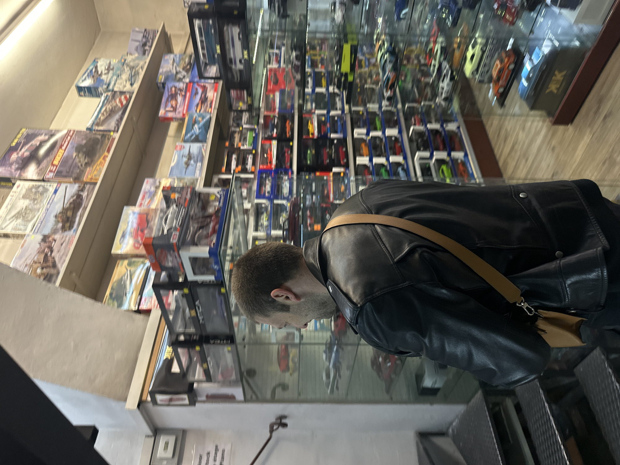 A male individual with short brown hair and stubble is observed from behind and slightly to the right, standing inside a retail establishment in Como, Italy. He is wearing a dark leather jacket and a tan crossbody bag over his right shoulder. His gaze is directed towards the right, observing an array of merchandise. The establishment features light-colored wood laminate flooring and white walls. On the left, dark metal open-tread stairs descend, with a dark handrail visible. A partial white sign with dark text, including words like "shock" and "Piano," is affixed to the wall near the stairs. The interior is brightly lit, showcasing numerous display units. Multiple glass display cases line the walls and stand independently, filled with rows of miniature vehicles, predominantly cars, some in individual clear boxes with branding like "KK" and "Mica." Above these cases, white shelves are stocked with various boxed model kits, many depicting military tanks, aircraft, and other vehicles.