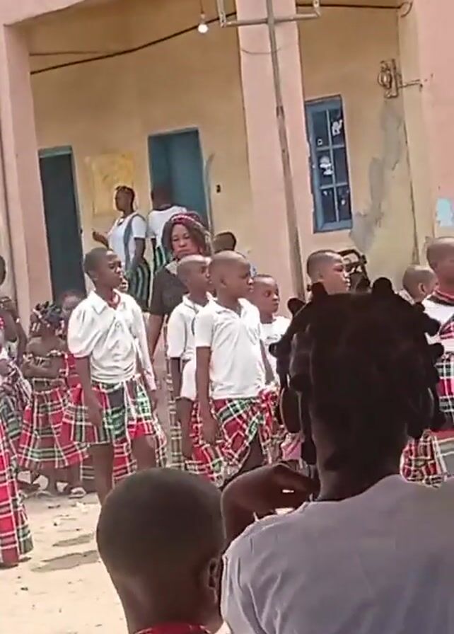 group of children and a woman wearing traditional red plaid skirts and white shirts walking in a line in what appears to be a schoolyard. The children have various hairstyles, including braids and shaved heads. The woman has a black top. There are onlookers and structures like a pink building with blue-framed windows in the background. A tent is partially visible in the upper right corner. The person filming is seated. The scene is bright and appears to be outdoors.