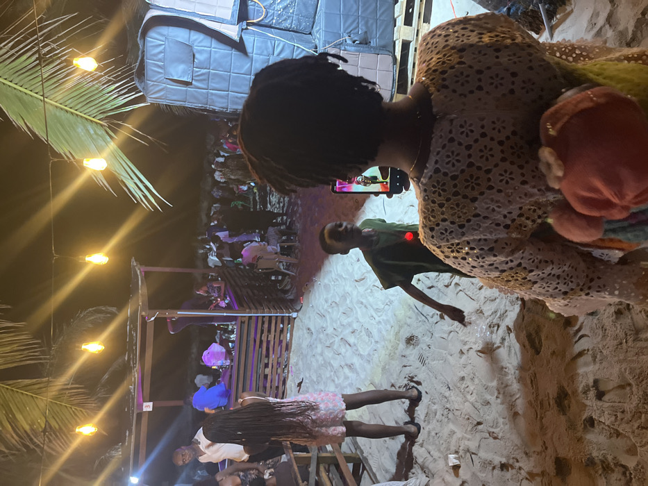 An outdoor nighttime scene on a sandy beach with lights strung from palm trees. A person in the foreground takes a video with their phone of a person walking on the sand. A crowd is blurred in the background behind a wooden structure where people are seated. A large sound system is stacked nearby. Several individuals are scattered in the sand.