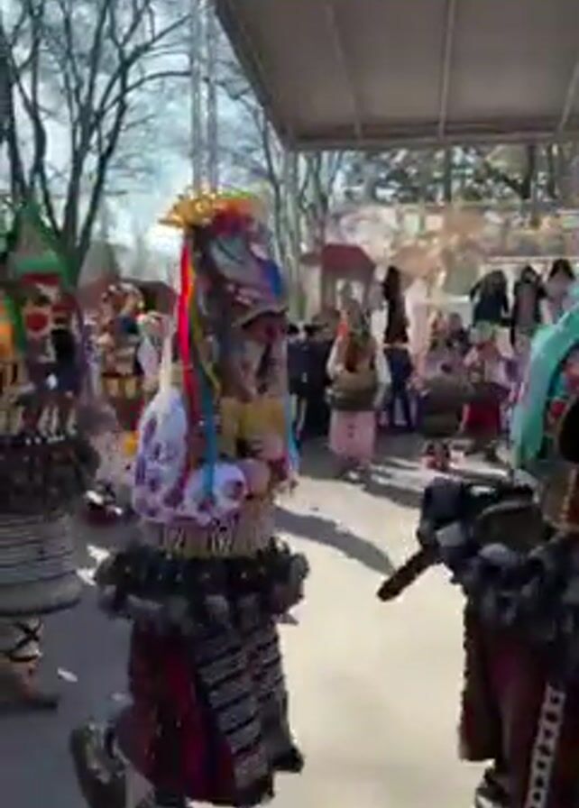 group of people dressed in traditional Bulgarian Koukeri costumes walking outdoors on a paved surface