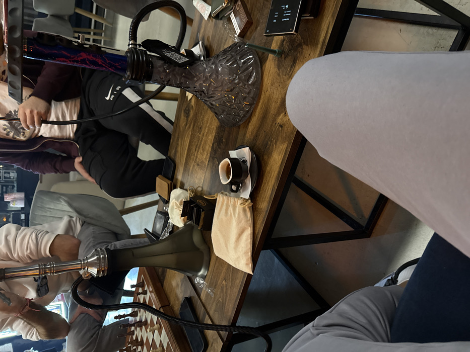 The image depicts an indoor scene within a modern lounge or cafe setting. Three individuals are present, with the lower body of the person capturing the image visible in the immediate foreground, showing light grey trousers and dark blue lower legwear. Two other individuals are seated at a rectangular dark wooden table with black metal legs. The person on the left wears a white long-sleeved top and light grey trousers, holding a hookah hose. The person on the right wears a dark red hoodie and black cargo-style sweatpants featuring a white "AIR" logo and stripe, also holding a hookah hose. On the table, a wooden chessboard with chess pieces is positioned on the left. Two distinct hookahs are prominent: a dark grey, sleek hookah with a silver metallic stem on the left, and a textured dark grey hookah with a purple and blue patterned stem on the right. Other items on the table include a small black coffee cup on a black saucer with a spoon, a small light-colored fabric drawstring pouch, a small black wooden box containing multiple small brown packets, and several smartphones. A brown wallet-like item, a green slender object, and a small rectangular brown package are also visible. The floor is a light grey concrete-like surface, and the blurred background shows light grey upholstered chairs and an indistinct modern interior. The specific location within Plovdiv, Bulgaria, cannot be identified from the visual information provided.