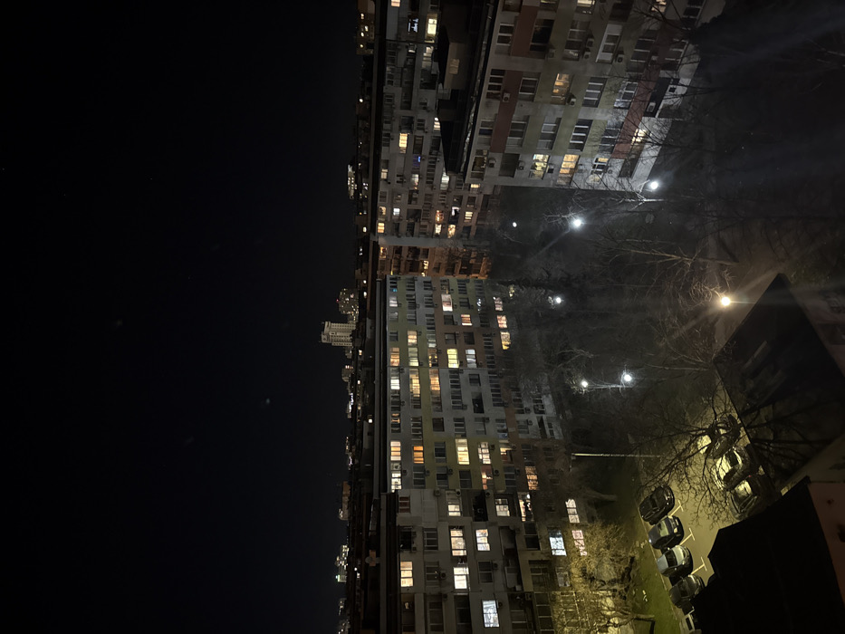 The image depicts an urban night scene in Burgas, Bulgaria, captured from an elevated perspective. The upper half of the frame shows a dark, clear night sky. Below, multiple multi-story residential buildings, consistent with apartment blocks featuring a mix of grey, beige, and light orange facades, dominate the landscape. Approximately 50-60 windows across the visible structures emit interior illumination, primarily in white and warm yellow tones. Numerous external air conditioning units are mounted on building walls and balconies. Interspersed between the buildings are green spaces containing deciduous trees with bare branches, indicative of a late autumn or winter season. These areas and adjacent pathways are illuminated by several modern streetlights emitting bright white light, with some exhibiting lens flare. In the lower-left quadrant, a paved parking lot is visible, accommodating a minimum of six parked passenger vehicles. No human figures or discernible activities beyond the ambient illumination are present within the frame. The scene portrays a densely populated residential district during nighttime hours.