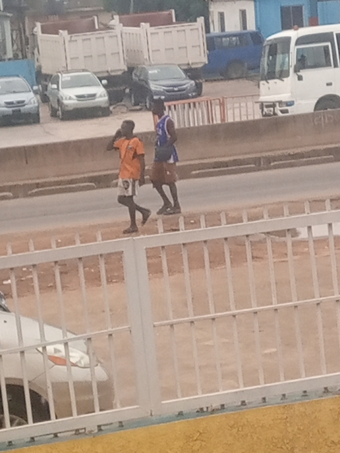 The image presents an urban street scene in Ijaiye, Nigeria, viewed from an elevated perspective behind a white metal fence. In the midground, two young adult males walk from left to right on a paved surface adjacent to a concrete road barrier. The male on the left wears an orange short-sleeved shirt, white shorts with a graphic design, and dark sandals, holding a dark object to his right ear, consistent with a mobile phone. The male on the right wears a blue and white sleeveless jersey, brown shorts, and dark athletic shoes, with a dark bag slung across his chest. Beyond the concrete barrier, a multi-lane asphalt road is visible. In the background, a variety of vehicles are present: a light-colored sedan, a silver SUV, two white dump trucks, a dark blue SUV/minivan, and a white short bus. Distant buildings are partially visible under an overcast sky.