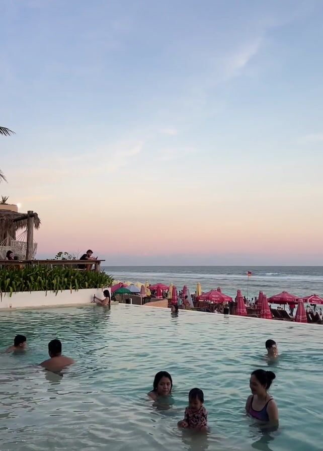 view of a resort pool at dusk. Several people are in the pool, including adults and children, some with their faces visible. The pool appears to be an infinity pool, with the ocean visible in the background. Numerous pink and yellow umbrellas line the beach in the distance. A structure with a thatched roof and some people is visible to the left of the pool. The sky is a mix of blue, pink, and orange, suggesting a sunset or sunrise. Music is playing in the background.