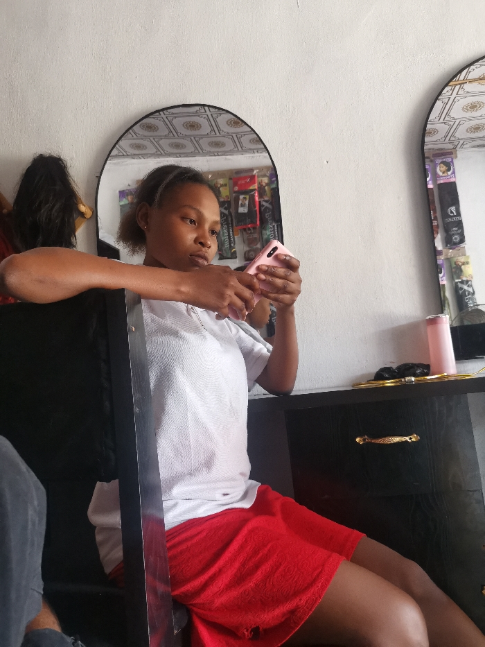 An indoor scene in the city of Unknown, Unknown, depicts a young woman seated, intently focused on a light pink smartphone held in both hands. She wears a white short-sleeved top and a red skirt. Her hair is dark and pulled back with a dark headband. She is seated in a dark chair, with a portion of another person's leg visible to the lower left. Behind her, a white wall features two arched mirrors with black frames. The reflections in the mirrors show a patterned ceiling and various packaged hair extensions hanging, indicating a commercial establishment like a hair salon or beauty supply store. To the woman's right, a dark two-drawer dresser or cabinet with a gold-colored handle holds a pink cylindrical object, black cables, and a small black electronic device. To the far left, a dark, long wig or hairpiece is partially visible. No direct interactions with others are observed.