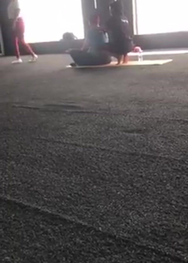 In a well-lit room with a black, grainy floor, two individuals are on a yoga mat