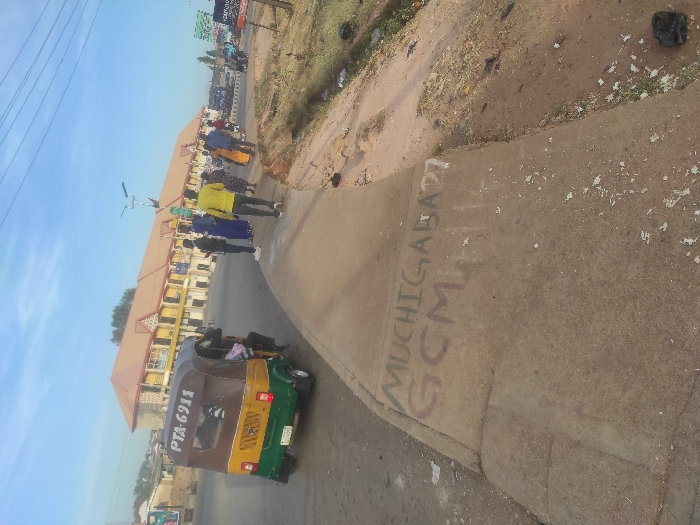 A street view shows a tricycle taxi, labeled "PTA-6911," parked near a building. People are walking along the road in the background. Graffiti is written on the pavement in large letters. Debris litters the roadside. Overhead power lines are visible against a slightly hazy sky. The scene appears to be in a developing area, likely a small town.