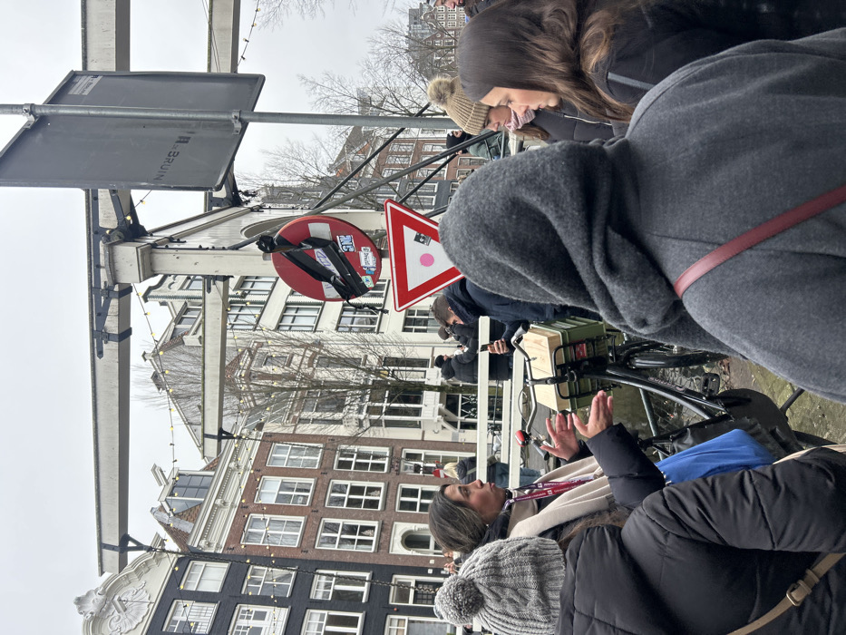 The image depicts an overcast daytime urban scene in Amsterdam, Netherlands, likely situated on a canal bridge or adjacent street