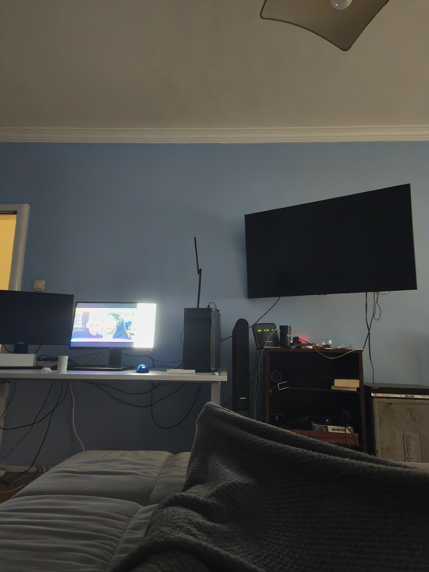 The scene appears to be an interior living space. The main subjects are computer and entertainment equipment arranged against a blue wall. A large television is mounted on the wall to the right of a desk with computer monitors, a PC tower, and peripherals. Below the TV is a dark-colored shelving unit with various items on its shelves. In the foreground is a gray couch with a blanket draped over it. The lighting is somewhat dim and appears to be artificial. The location cannot be determined from this image; therefore, it is impossible to provide the location in Sofia, Bulgaria.