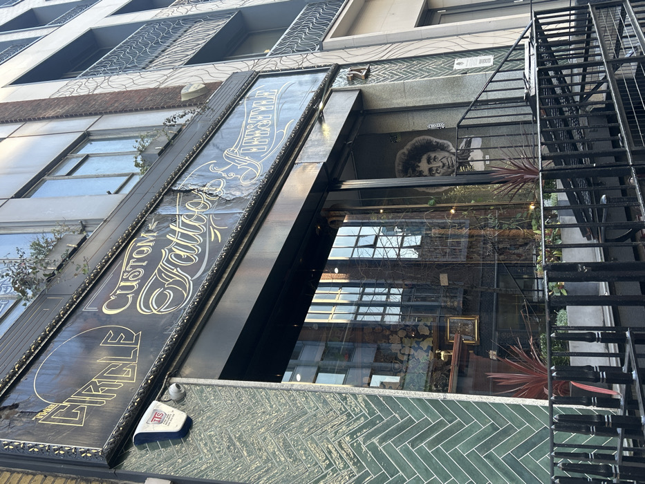 A low-angle shot captures the entrance to "Circle Custom Tattoos," adorned with a black sign featuring ornate gold lettering. Reflections bounce off the glass storefront, revealing glimpses of the interior and the building across the street. Above the entrance is a black and white portrait. A fire escape runs up the right side of the building. Herringbone-patterned tiles form the facade below the entrance.