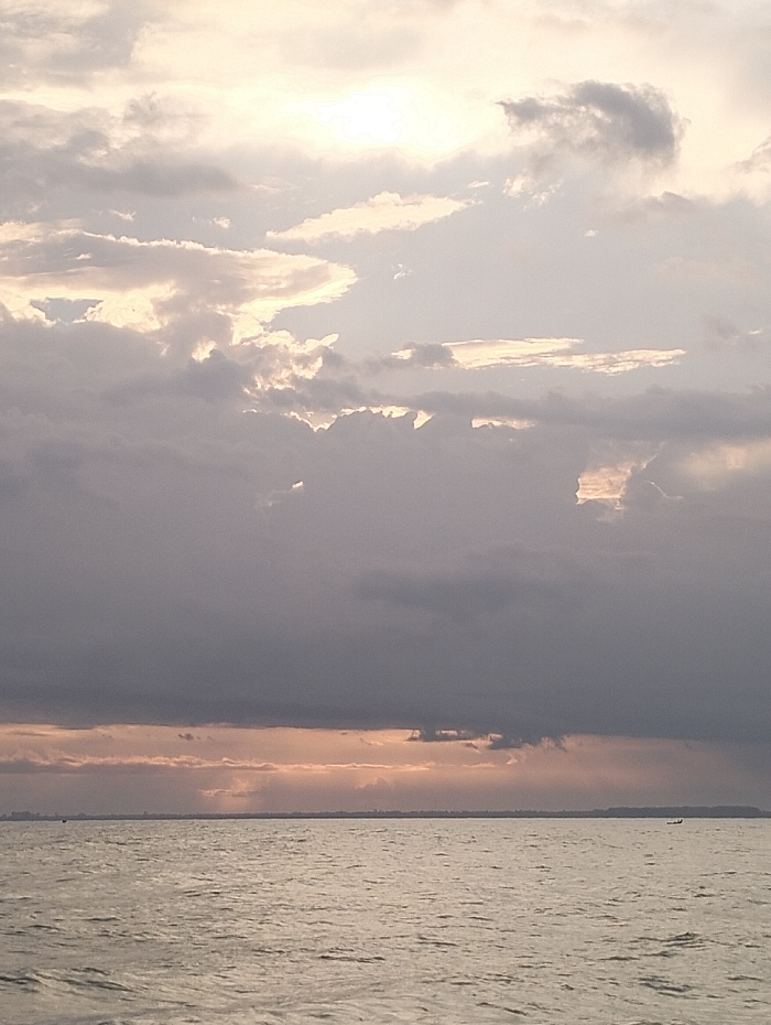 The image captures a serene seascape beneath a dramatically cloudy sky. The water, reflecting a muted golden light, stretches to the horizon. Above, dense layers of grey and white clouds dominate, partially obscuring the sun. Distant landmasses are faintly visible across the horizon, adding depth to the scene. A small boat bobs gently on the water. The overall tone is peaceful, imbued with a sense of quiet contemplation.