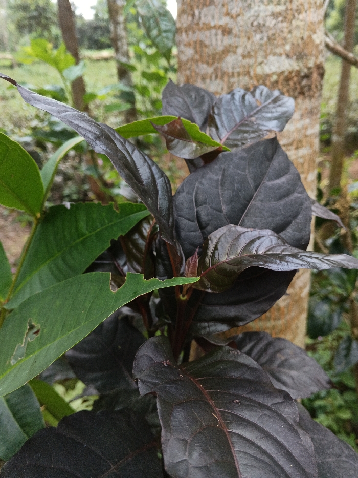 The scene, located in the City of Unknown, Vietnam, presents a detailed view of foliage. Dominating the foreground and right is a plant characterized by dark purplish-green, ovate leaves with distinct venation. Newer leaves exhibit a reddish-green hue. To the left, a separate plant displays vibrant green leaves, two of which show damage consistent with insect activity, manifesting as irregular perforations and marginal consumption. A light-barked tree trunk, out of focus, occupies the central right background, with additional blurred green foliage suggesting a natural outdoor environment. No human subjects or their actions are depicted.