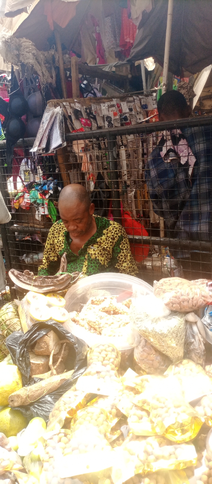 This image captures a vibrant market stall in Nkpor, Nigeria. A bald adult male, wearing a green and yellow patterned short-sleeved shirt, is seated centrally, looking downwards at the merchandise displayed before him. To his right, the back of another individual's head and a shoulder clad in a dark blue plaid shirt are partially visible behind a metal grid. The foreground showcases a dense array of products on a stall surface: numerous transparent plastic bags filled with light-colored, spherical nuts or seeds; a clear plastic container holding similar items; a large, dark, dried, curved pod or root; slices of yellow citrus fruit; several rounded green fruits or gourds; and a black plastic bag containing pieces of yam or other root vegetables. A bag of dried green herbs is also present. Behind the seated male, a metal grid serves as a display for various small packaged items, including what appear to be hair accessories or small consumer goods. Black and grey bras hang on the left, while an assortment of colorful clothing and fabrics are visible throughout the cluttered background. The stall is sheltered by an overhead structure composed of a dark tarp and lighter fabric, supported by wooden beams.