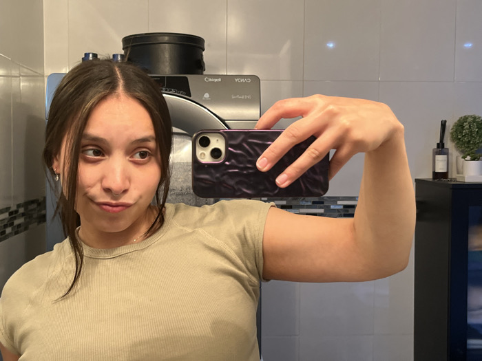 A young woman takes a selfie in a bathroom. She holds a purple phone in her right hand and wears a beige t-shirt. Her hair is brown, parted in the middle, and styled with loose strands framing her face. Behind her is a washing machine with a dark container on top, white tiled walls, and a black cabinet with a plant on top. The woman is looking to her left with a slightly puckered expression.