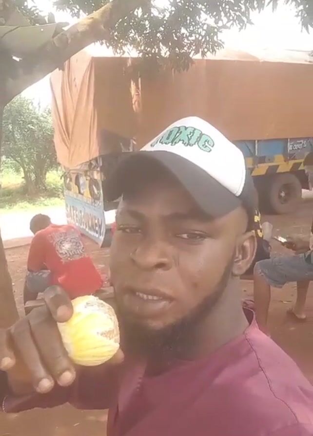 man in a burgundy shirt and a white and black cap with "TOXIC" written on it. He is holding a peeled citrus fruit in his left hand and looking at the camera. In the background, other men are sitting or standing near a large covered truck. The scene is outdoors, likely under a tree, as evidenced by the branches and leaves overhead.