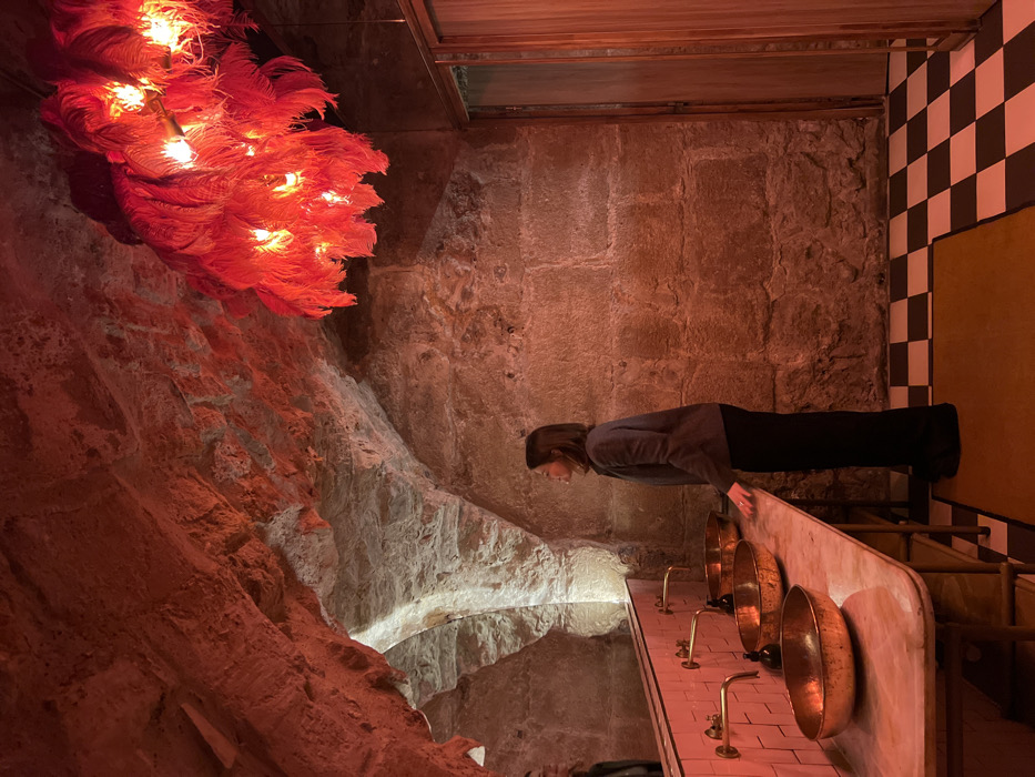 The image captures a distinctively styled washroom in Paris, France, likely located within a Big Mamma Group restaurant such as Pink Mamma in the 9th arrondissement. The room features ancient, rough-hewn stone walls and a vaulted ceiling, providing a cave-like aesthetic. Dominating the scene is a large, elaborate chandelier composed of numerous bright red feathers and exposed light bulbs, casting an intense red-orange glow throughout the space. A woman with shoulder-length brown hair, wearing a dark grey blazer and black trousers, stands in profile on the right, looking upwards towards the ceiling or the chandelier. Her right hand rests lightly on a long, light-colored marble counter. Set into the counter are three round, copper-colored basin sinks, each equipped with a brass-toned wall-mounted faucet. Two dark pump bottles are positioned between the sinks. Above the counter, a large rectangular mirror reflects a partial view of the room and the woman's reflection. The floor beneath the woman is covered by a solid reddish-brown mat, which transitions to a black-and-white checkered tile pattern further into the room. A wooden door or paneling is visible on the far right.