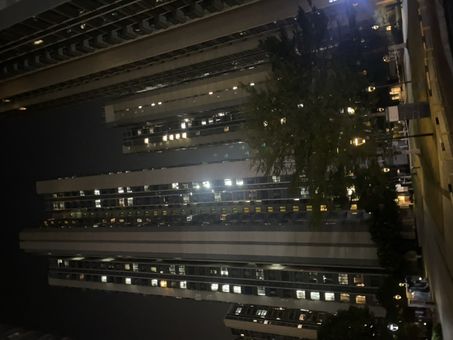 Tall apartment buildings with illuminated windows fill the night scene. A dark tree stands to the right of the frame, partially obscuring some buildings. Streetlights are visible beside a concrete wall on the right. Above, more buildings line the sky. The scene has been rotated.