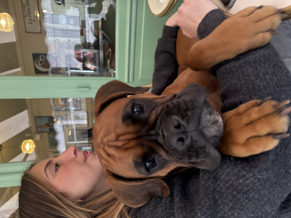 A female individual, visible from the mid-chest up, with long brown hair, wears a dark grey knitted top. She holds a fawn-colored Boxer dog, which appears to be a puppy or young adult. The dog, with a dark muzzle, rests its head and front paws on her arm and chest, looking directly at the camera. The female's face is in profile, looking towards her left. A small, partially visible white circular table with a gold-colored rim is present on the right. The background reveals the interior or a reflection of a establishment through a large window with light green frames. A prominent sign visible in the window reads "BRASSERIE LA PISCINE," identifying the location as Brasserie La Piscine at 126 Rue de Billancourt, Boulogne-Billancourt, France. Further background details include a white and light green striped awning, two overhead pendant lights with textured glass shades, and framed artwork on the wall, one depicting a figure with large white glasses.