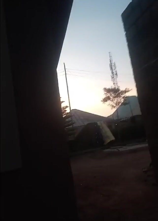 The camera peers through a narrow gap between buildings, offering a view of a partially obscured yard at sunrise or sunset