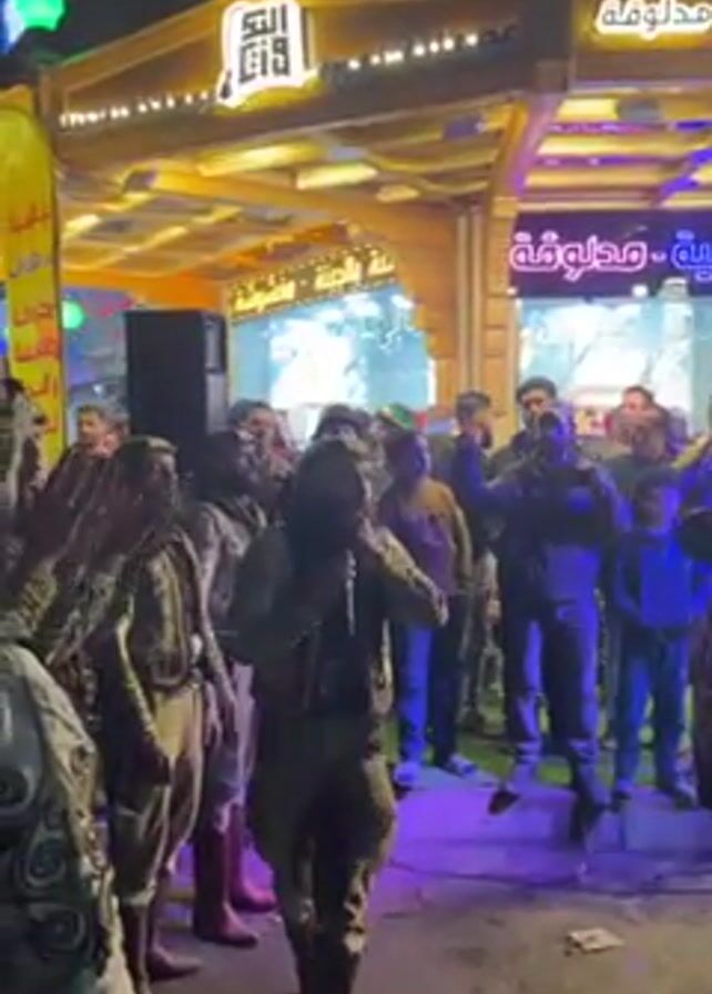 A lively scene unfolds at night, possibly in a Middle Eastern or North African setting. The video captures a group of men, some dressed in what appears to be traditional clothing or military-style uniforms, dancing and singing in a public space. The central figure holds a microphone and appears to be leading the performance. Other individuals in the crowd are watching, filming, and engaging with the performance. The environment is a bustling street with lit storefronts. The lighting is a mix of white and colored lights, including blue and purple hues. The storefronts have signs in Arabic. The overall impression is that of a cultural celebration or a street performance in a vibrant urban setting.