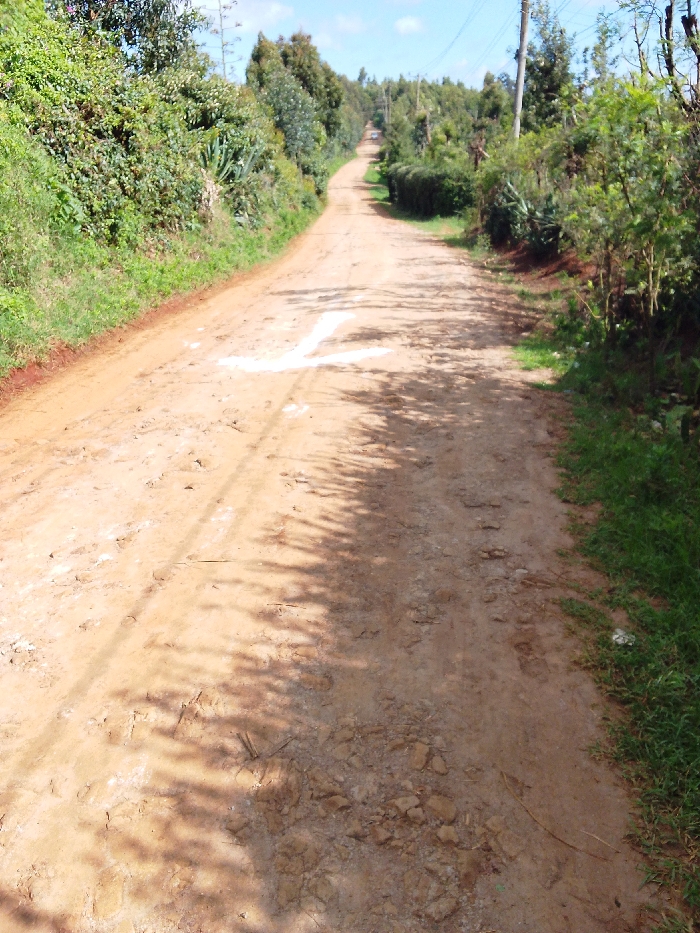 This image depicts a rural dirt road in Ndeiya, Kenya, receding into the distance under a bright sky with scattered clouds